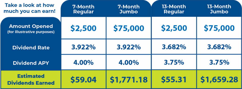 Certificate must be opened between 11/6/2025 and 12/10/2025. To qualify for the promotional Annual Percentage Yield (APY) you must open a new Certificate with promotional term of 7 or 13 months. Minimum deposit amount for certificate promotional offers: $500 for a regular Share Certificate, $75,000 for a Jumbo Share Certificate or $50 for members under 18 years old. APY assumes daily compounding of principal and interest. Early withdrawal of dividends or principal may affect your APY earned. There may be a substantial penalty for early withdrawal. A 7-month certificate renews automatically for a 6-month term, and a 13-month certificate renews automatically for a 12-month term at the rate in effect at the time of renewal unless otherwise directed. Offer subject to change at any time at our sole discretion without notice.